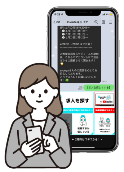 お気軽に公式LINEからご相談ください。LINE上でヒアリングを行い、条件に合った求人をご紹介します。